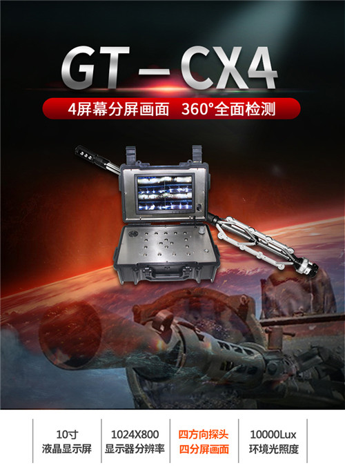 簡介——GT-CX4工業(yè)容器內(nèi)窺鏡可實(shí)現(xiàn)一屏四用的檢測效果,分屏檢測更加精細(xì)、全面,管道/容器內(nèi)部360°檢測無死角。自帶可調(diào)節(jié)