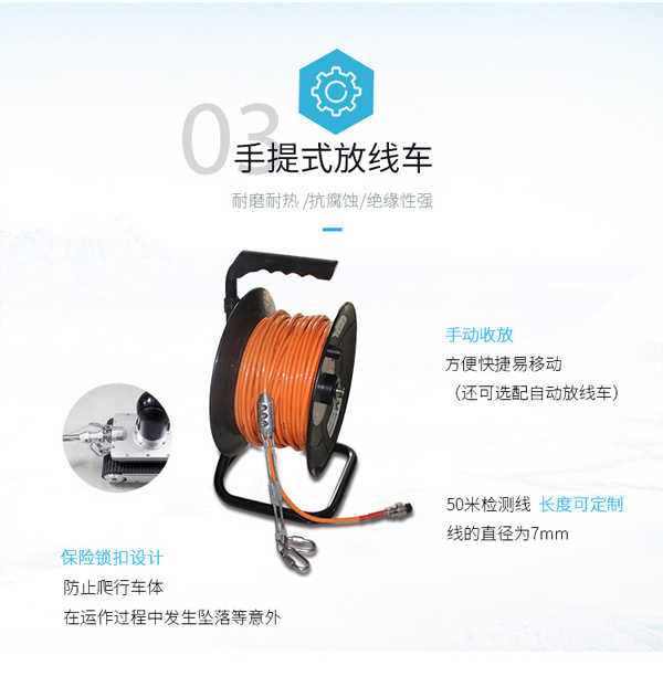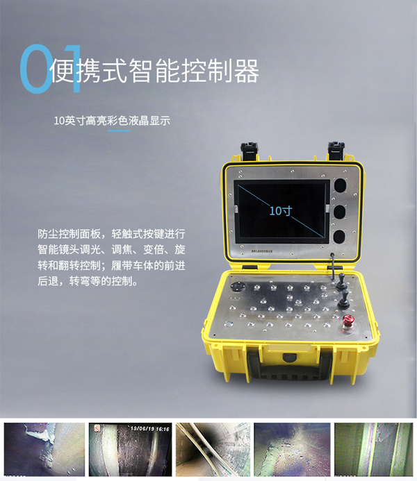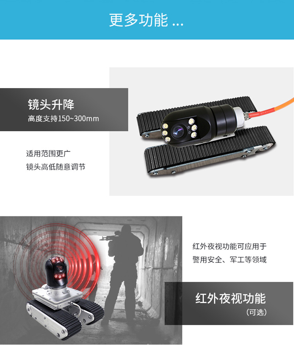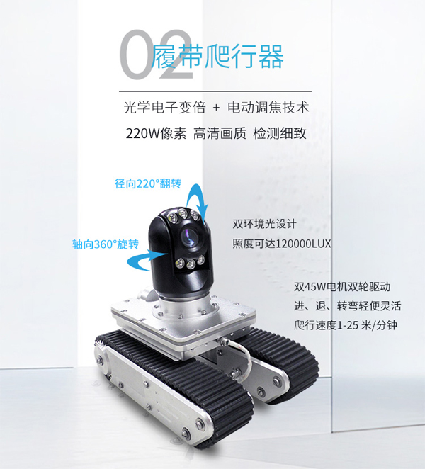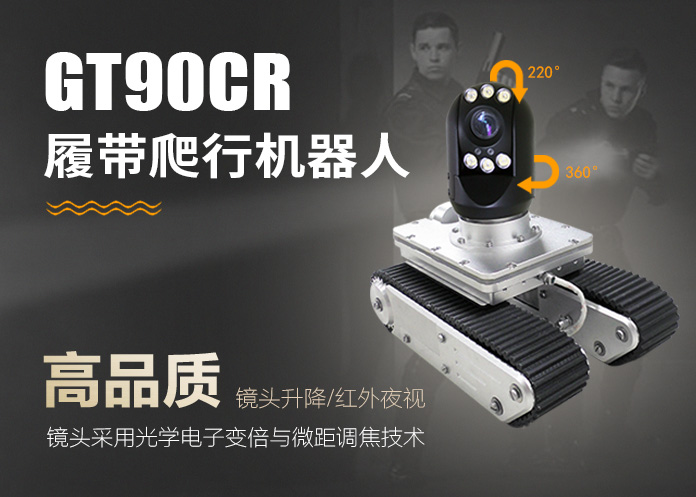 GT90CR系列履帶爬行器由智能可旋轉(zhuǎn)、翻轉(zhuǎn)、變倍、對焦鏡頭、智能大功率長時段爬行控制器、專用凱夫拉電纜收放車等組成。