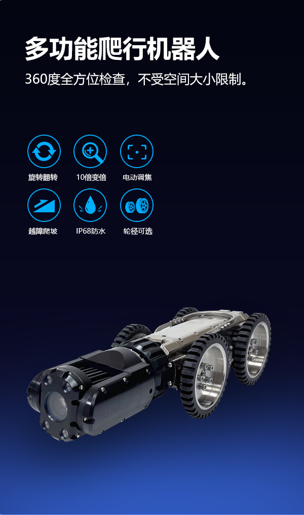 簡介——GTR120B系列工業管道檢測機器人是一款具備變倍功能的超清管道內部檢測機器人,能夠代替人工進入 管道內部,通過搖桿控制