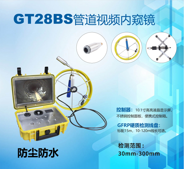 GT28系列管道內窺鏡是一款多功能型內窺鏡,10.1寸高清顯示智能控制器,10-50m材質為GFRP檢測線可供長距離檢測。直徑28mm電動調焦鏡頭在管道內部全方位觀察。