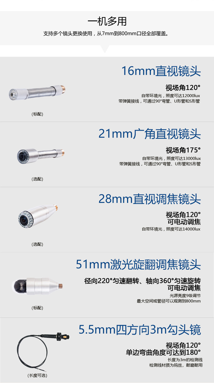 EXPERT系列工業視頻內窺鏡實現了管道鏡與勾頭鏡的完美結合,一機多用,兼容性強。鏡頭通過旋轉翻轉、調焦、激光測量、異物打撈等功能,能夠高效的對不同直徑的管道內部進行檢測、診斷,并實時記錄管道內部工況。檢測過程中圖像支持中英文命名及抓拍功能,支持WIFI熱點連接,可隨時進行遠程數據傳輸,在線查詢資料等,方便快捷!